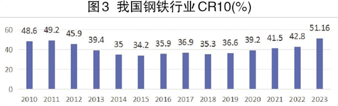 行業集中度加速提升。當前,我國鋼鐵行業相對於上遊原材料行業、下遊用鋼行業的集中度均偏低(見圖3),仍處於較為分散狀態。據統計,2023年,我國鋼鐵行業CR4、CR10分別為26.4%、51.16%。其中,CR4仍遠低於美國的79%、日本的80%和歐盟的73%。