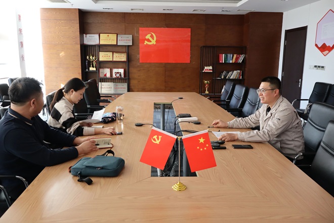 圖為劉旭明(右一)向《中國冶金報》記者講述高端矽鋼研發故事