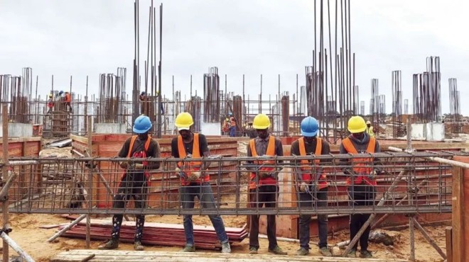 圖為春節期間,中國二十二冶安哥拉項目部員工正在進行鋼筋綁紮工作。(中國二十二冶 供圖)