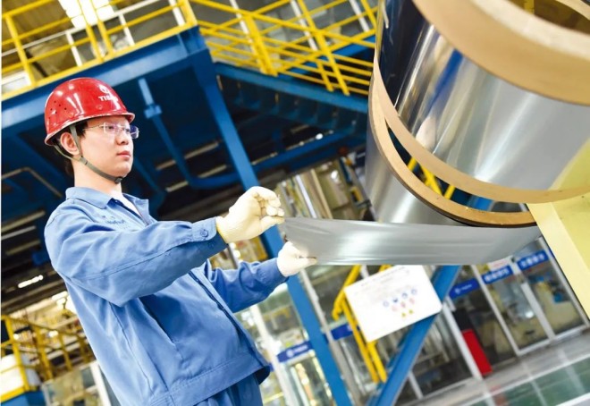 在山西太原,太鋼火熱的生產線上,降碳比例達70%的高表麵/冷成型用鋼SPHC-LCE熱軋鋼帶正在快速下線準備運往某大型集團,將被加工成最新款的國際知名品牌手機、平板等3C產品的精密零部件。