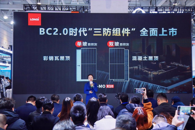 3月5日,隆基綠能在第二十屆中國(濟南)國際太陽能利用大會暨第四屆中國(山東)新能源與儲能應用博覽會上發布基於HPBC2.0技術的防積灰組件——Hi-MO X10防積灰組件,最高功率可達670W,轉化效率高達24.8%,疊加隆基在行業內首創的防積灰技術,單位麵積理論發電量較常規TOPCon組件高出10%以上。