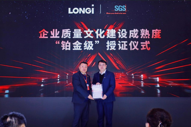 發布會上,隆基榮獲國際公認的測試、檢驗和認證機構SGS頒發的行業首張GB/T 32230-2015《企業質量文化建設指南》鉑金級證書。