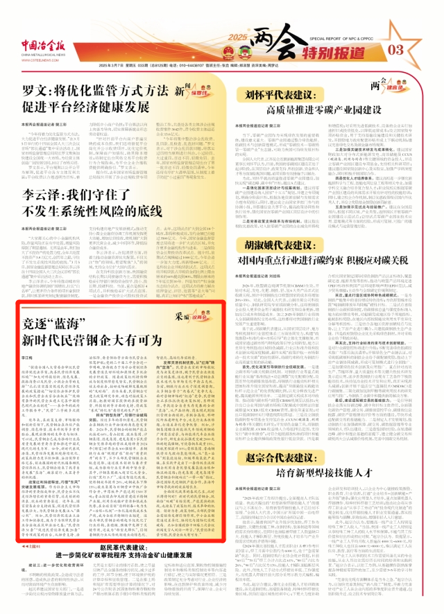 全麵深化改革的春風已至,此時不搏待何時!新時代的民營鋼企,既麵臨“雙碳”目標實現、產能置換的挑戰,也迎來了政策紅利、技術革命的機遇。創新為舟、政策為帆,頭部民營鋼企需繼續發揮引領作用,中小企業則需通過差異化、協同化與國際化實現破局。正如全國政協十四屆三次會議新聞發言人劉結一所言:“民營經濟前景可期,民營企業大有可為。”(李江梅)
