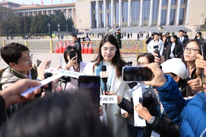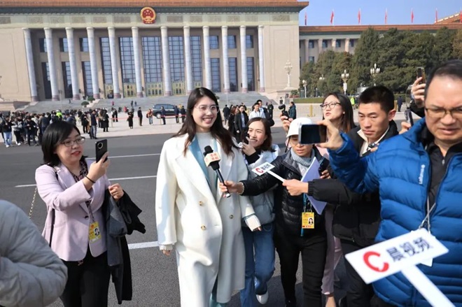 張雨霏在被眾多媒體追逐的情況下,回答了中國冶金報社兩會報道組記者的追問