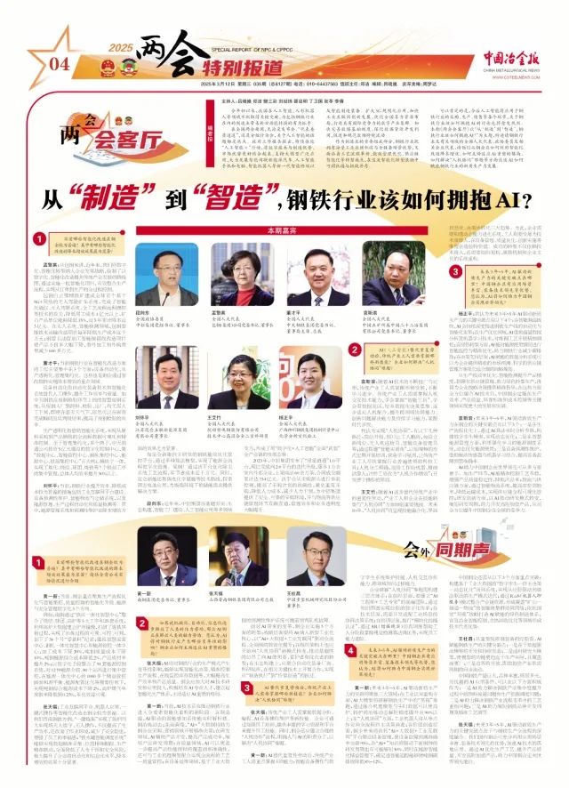可以肯定的是,今後人工智能將應用於鋼鐵行業的采購、生產、銷售等各個環節,關於鋼鐵行業該如何擁抱AI的討論也將愈發熱烈。本期《兩會會客廳》以“從‘製造’到‘智造’,鋼鐵行業該如何擁抱AI?”為主題,特邀請鋼鐵行業及有關領域的全國人大代表、政協委員及相關企業代表,請他們從鋼企應如何利用智能化改造降本增效、如何主動適應AI重塑的格局、如何解決“人機協同”難題等方麵談談AI如何賦能鋼鐵行業的新質生產力發展。