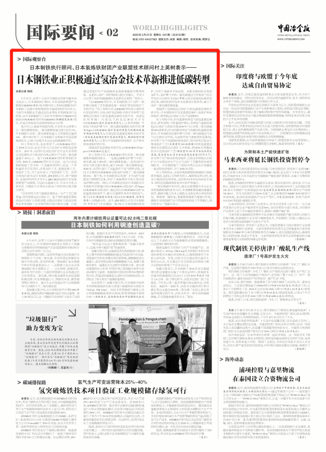 3月13日,在第十五屆中日鋼鐵業環保節能專家交流會上,日本製鐵執行顧問、日本氫煉鐵財團產業聯盟(GREINS項目)技術顧問村上英樹在做題為《日本鋼鐵工業碳中和轉型的技術挑戰》的報告時表示,當前日本鋼鐵業正通過氫冶金等技術革新推動行業轉型,由日本新能源與工業技術發展組織(NEDO)資助的COURSE50項目和GREINS(煉鋼綠色創新)項目,正逐步發展成為這場轉型的動力引擎。
