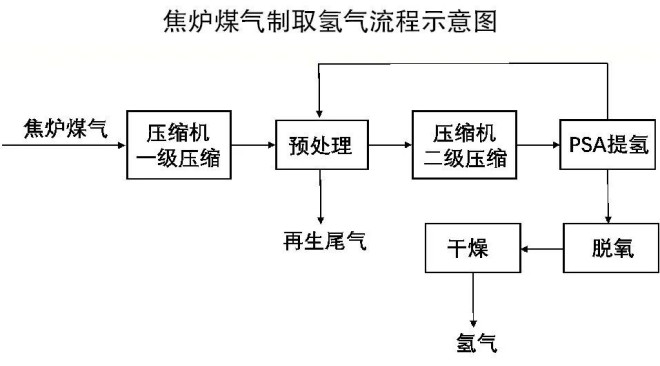 目前,工業化常用的焦爐煤氣製氫的方法為變壓吸附法(PSA),qihexinyuanliweitongguoyalizhouqixingbianhuashixianxifujiduizazhidexuanzexingxifuyujiexi,liyongjiaolumeiqizhongqingqiyuqitaqitizufenzaixifujishangdedonglixuetexingchayiwanchengfenli,zuizhonghuodegaochunqingqi。gaigongyiwuxuhuaxuefanying,yilaiwulixifudekenixing,juyounenghaodi、操作溫度溫和(常溫)的優勢,具體流程如圖所示。