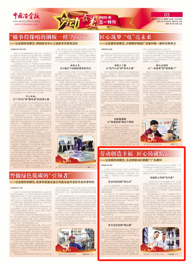 4月28日,慶祝中華全國總工會成立100周年暨全國勞動模範和先進工作者表彰大會在北京人民大會堂舉行,大冶特殊鋼有限公司460鋼管廠廠長唐科憑借一雙巧手、一顆匠心、一份堅持走上了人民大會堂領獎台,成為全國勞動模範。