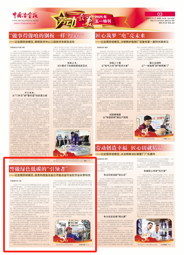 2024年9月份,李利傑帶領團隊在國際上首次實現“綠氫”氫冶金工業化生產,直接還原鐵合格率達到100%,成功驗證了“綠電—綠氫—綠鋼”生產的技術可行性,助力企業邁出了探索全綠氫近零碳氫冶金技術的重要一步,登上2024年度“行業綠色低碳引領十大事件”榜單。