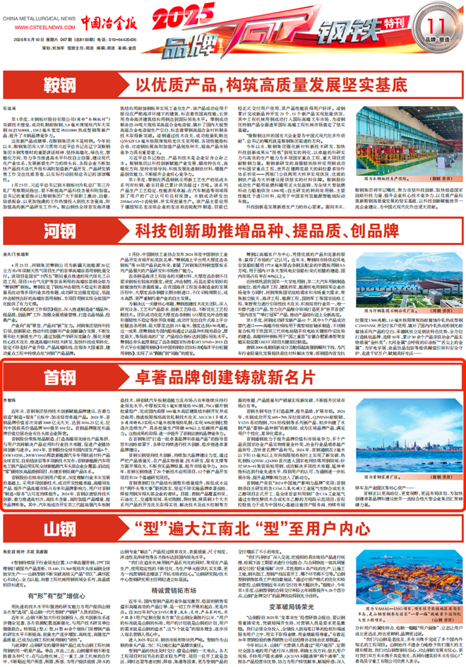 首鋼股份在精準識別用戶需求、深度理解行業未來發展的基礎上,采用多項創新技術,成功開發性能卓越、高端領先產品,提升產品高端市場占有率和品牌影響力,用戶對首鋼“製造+服務”認可度持續提升。2024年,首鋼京唐堅持技術創新,著力推進高檔次、高技術含量、gaofujiazhichanpinzengliang,tishengpinpaixingxiang。qizhong,qichebanchenggongkaifadisandaichaogaoqiangqichebanzhizaojishu,xinlvmeiqichebanzhizaonenglijishichangzhanyoulvjixubaochixingyelingxianshuiping;中厚板實現5毫米薄規格9Ni鋼、75Cr鋸片鋼批量穩產,完成國內最厚160毫米高層建築結構鋼開發並成功商用;推進極限規格高效軋製技術攻關,MCCR(多模式全連續鑄軋)實現0.7毫米極薄規格軋製;實現50%廢鋼比整澆次連續生產,具備批量生產降碳40%以上低碳排產品能力。這些成果的取得,進一步提升了首鋼京唐的品牌競爭力。