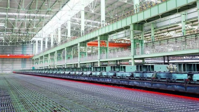 我是一條即將成型的抗震鋼筋,正在1100℃的烈焰中積蓄力量,等待新生。軋機轟鳴,輥道震顫,火紅的鋼坯被送入粗軋機,像一條被喚醒的火龍,在軋輥間翻騰、伸展。冷卻水噴淋而下的瞬間,我聽見質檢員的聲音:“牌號HRB650E,屈服強度660兆帕,最大力總延伸率12%,抗震性能達標。”