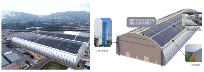 ▲圖為陝鋼龍鋼新建料場項目。(左為施工完成實拍圖,右為運維設施示意圖)