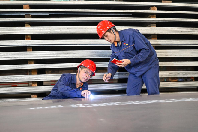湘鋼技術人員正在對鋼板進行表麵質量檢查。(賀意波 拍攝)