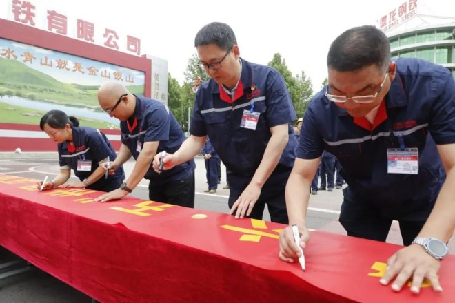 辦公樓前,以“會操心,敢著急,能解決”為背景,在“紀念六•五環境日”的條幅下,數百名職工鄭重簽下名字。這不是簡單的簽名,而是德龍人對生態環境的莊嚴承諾:從一線工人到管理團隊,每個人都是環保踐行者!一筆一畫間,是“鋼鐵硬漢”的溫柔堅守,更是“綠色工廠”的全民共識。