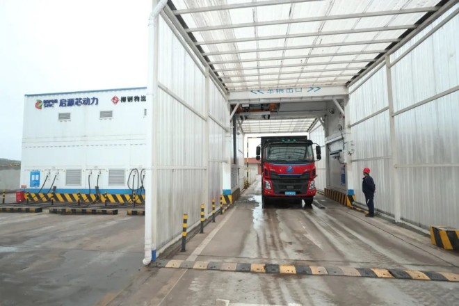 柳鋼物流公司智能換電站,新能源貨車進站換電全程不到5分鍾。閻翔 攝