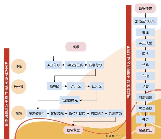 以廣東一家五金製品廠為例,生產指甲刀的原材料多選用高碳鋼或馬氏體不鏽鋼,通過衝壓、熱處理、表麵處理、組裝等環節完成製造。其主要生產流程如下: