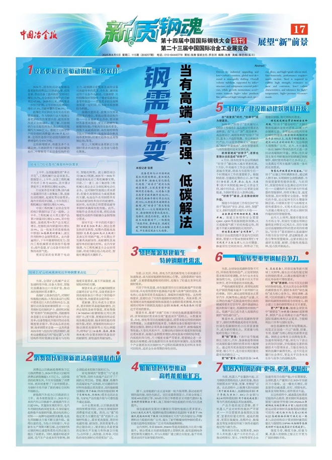 從中長期來看,以舊換新政策將持續釋放利好,對相關領域鋼材消費量形成支撐。然而,比“量”的穩定更為關鍵的是“質”的躍升:在鋼材性能上,要求更高強度,更好的電磁性能、耐蝕性、表麵質量等;在供應鏈協同上,要求鋼企具備更強的定製化開發能力和快速交付能力;在環保上,高性能、長壽命、可回收的綠色鋼材應用將更加廣泛。