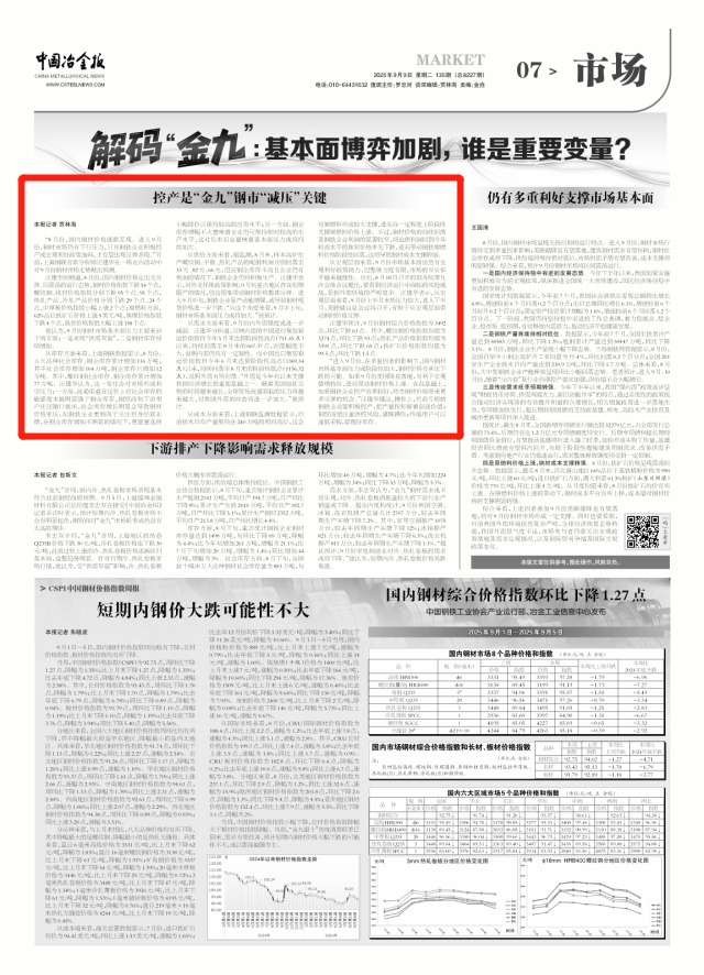 “8月份,國內鋼材價格漲跌互現。進入9月份,鋼材市場仍有下行壓力,隻有鋼鐵企業積極控產或宏觀利好政策加碼,才有望出現反彈表現。”日前,上海鋼聯首席分析師汪建華在一場業內活動中對9月份鋼材市場走勢做出預測。