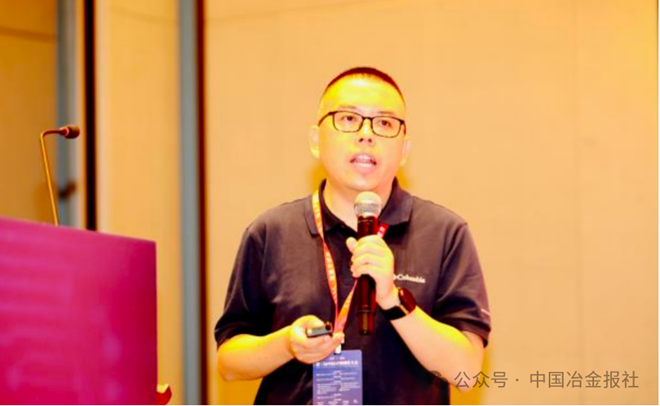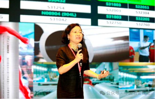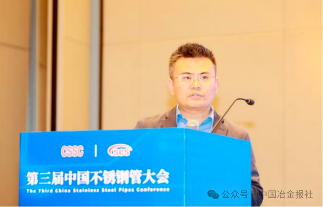 圖為中國寶武太鋼不鏽高級工程師、品質部部長王伯文做題為《新能源產業用鐵鎳基合金管材關鍵技術研究及應用》的主旨報告