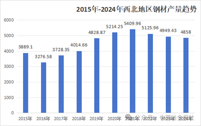 國家統計局數據顯示,2015-2024年,西北五省(陝西、甘肅、青海、寧夏、新疆)鋼材產量呈現“先增後穩”趨勢:2015 年總產量3889.1萬噸,2021年達到峰值5409.96萬噸,2024年回落至4858萬噸,整體符合國家鋼鐵產業“去產能、優結構”的導向。