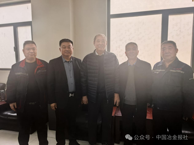 圖為2025年10月29日中國金屬學會專家委員會主任王天義(中間)、金鼎重工煉鐵廠廠長江海峰(右1)、高爐主任王主任(左1)、豫興公司技術專家周西辰(左2)、周紅朝(右2)在熱風爐操作室合影留念