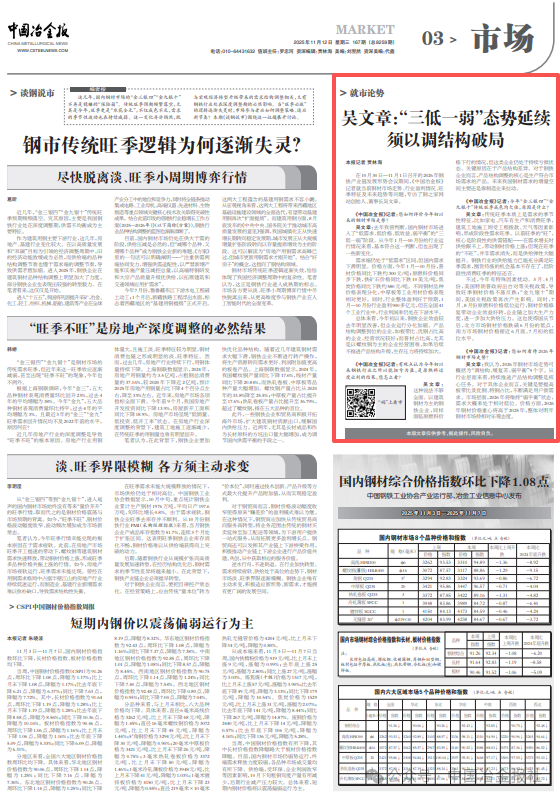 在10月30日—11月1日召開的2026年鋼鐵產業鏈發展形勢會議期間,《中國冶金報》記者就當前鋼材市場走勢、行業盈利情況、旺季特征及未來趨勢等問題,專訪了鋼之家網站創始人、董事長吳文章。