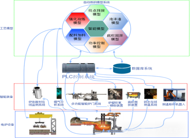 隨著互聯網、大數據以及檢測控製技術的發展,一係列智能化監測技術和控製模型在電爐煉鋼過程中得到應用,如智能配料、電極智能調控、智能化取樣測溫、泡沫渣智能化監測與控製、luqizaixianfenxijizhongdianwenduchengfenyubaodeng,jiancehekongzhijishudeyingyongdafudutigaoledianluliangangguochengdezhinenghuashuiping,dianluzhinenghuazhuangbeiyugongyimoxingzhijiandeguanxirutusuoshi。