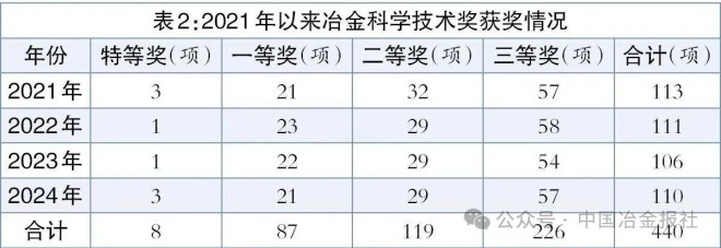 2021年—2024年,我國鋼鐵行業累計榮獲國家科學技術進步獎二等獎3項,分別為“耐火材料功能化與綠色化設計、製備及其對鋼鐵綠色製造的支撐”“基於二氧化碳資源化利用的綠色潔淨煉鋼技術及應用”和“大型金屬坯料製備電磁調控關鍵共性技術開發和應用”;共獲得冶金科學技術獎440項,其中特等獎8項、一等獎87項、二等獎119項、三等獎226項(2021年以來獲獎詳情見下表2)。