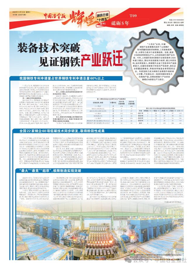 “十四五”以來,我國鋼鐵行業在科技創新領域取得顯著成果,其中冶金裝備呈現大型化發展趨勢,3項核心技術成果斬獲國家科學技術進步獎二等獎,鋼鐵專利申請量占世界鋼鐵專利申請總量的60%以上,我國已發展成為世界最大鋼鐵技術來源國。