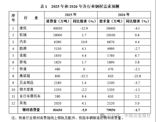 冶金規劃院根據鋼材消費係數法和下遊行業消費法綜合預測,2025年我國鋼材消費量為8.08億噸,同比下降5.4%;2026年我國鋼材需求量為8億噸,同比下降1.0%。其中,采用鋼材消費係數法預測的結果顯示,2025年我國鋼材消費量為8.15億噸,2026年我國鋼材需求量約8.13億噸。采用下遊行業消費法預測的結果顯示,2025年我國鋼材消費量約8.04億噸,2026年我國鋼材需求量約7.91億噸(詳見表1)。