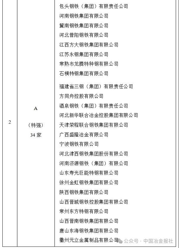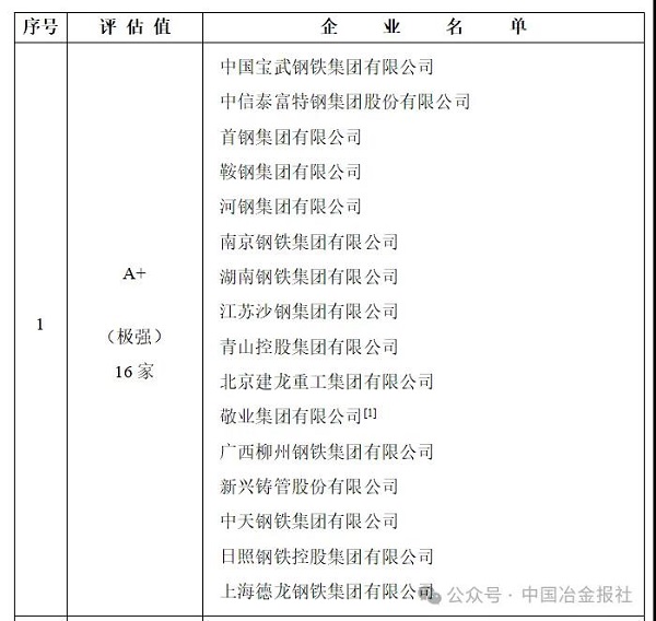 根據該院發布的中國鋼鐵企業競爭力(暨發展質量)評級(2025)榜單,中國寶武、中信泰富特鋼、首鋼集團、鞍鋼集團、河鋼集團、南鋼集團、湖南鋼鐵集團、沙鋼集團、青山集團、北京建龍集團、敬業集團、柳鋼集團、新興鑄管、中天鋼鐵、日照鋼鐵控股集團有限公司、上海德龍鋼鐵集團16家鋼企被評為A+(極強)鋼企,另有34家鋼企被評為A(特強)級,41家鋼企被評為B+(優強)級(詳見表3)。今年的A+、A級鋼企數量分別較去年下降2家、1jia,danhejicugangchanliangzhanquanguozongchanliangdebizhongjibenchiping,yejinguihuayuanzhuanjiahuiyingcheng,zhezhuyaoshiyinweichanyejizhongdudetisheng,yijijinliangniangangqijingyingshujupubianbujiyuqi。