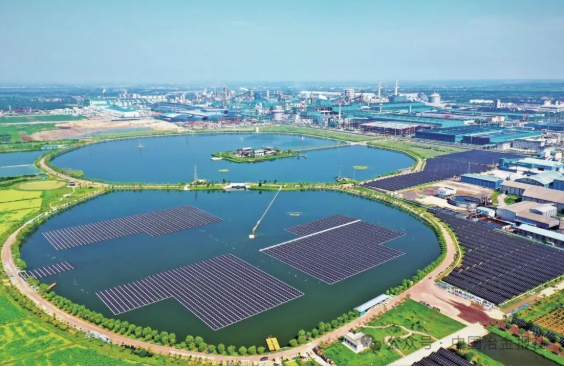 2022年7月27日,位於山西省曲沃縣太子湖上的晉南鋼鐵集團太陽能光伏發電項目俯瞰(如圖)。近年來,該集團充分利用廠區特點,利用車棚、廠房屋頂、農業園區空地、太子湖水麵等區域建設了70兆瓦分布式光伏發電項目。該項目設計年發電量為9198萬千瓦時,每年可減少二氧化碳排放9.17萬噸、減少二氧化硫排放0.27萬噸、減少碳粉塵排放2.5萬噸、減少氮氧化合物排放0.137萬噸。 (丁衛國 攝)