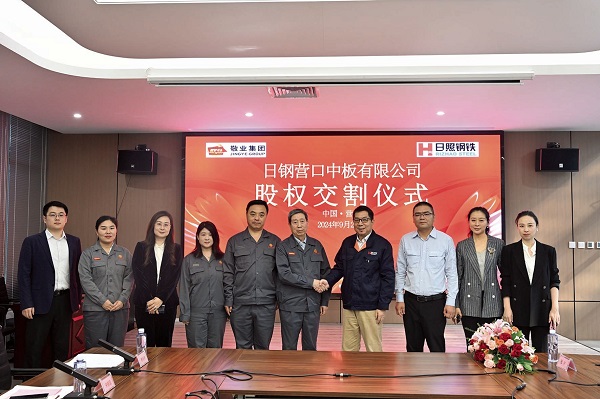 2024年9月29日ri,敬jing業ye集ji團tuan有you限xian公gong司si與yu日ri鋼gang營ying口kou中zhong板ban有you限xian公gong司si攜xie手shou合he作zuo,共gong同tong舉ju行xing了le營ying口kou中zhong板ban股gu權quan交jiao割ge儀yi式shi,標biao誌zhi著zhe雙shuang方fang正zheng式shi合he並bing。此ci次ci合he並bing後hou,敬jing業ye集ji團tuan與yu日ri鋼gang營ying口kou中zhong板ban將jiang攜xie手shou擁yong有you6條中厚板生產線,產能超1200萬噸,從而一舉成為全球領先的中厚板製造商。圖為交割儀式現場。 (本報資料圖片)
