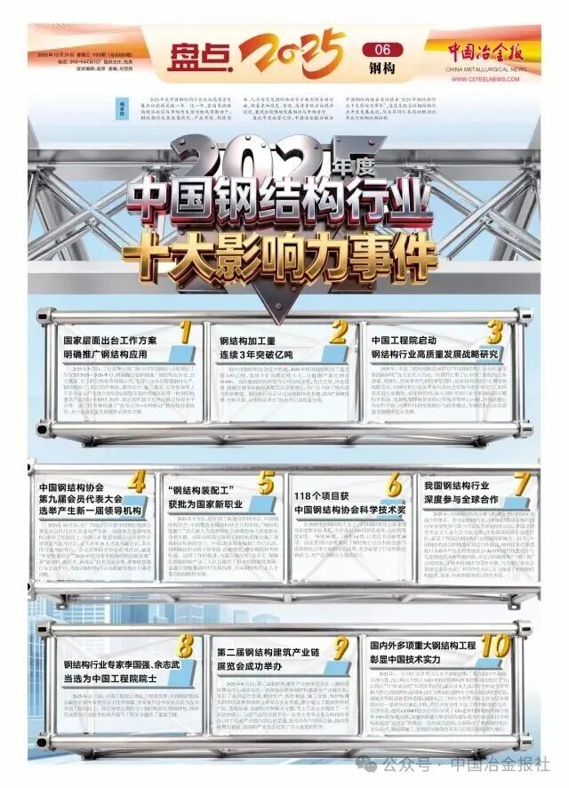 值此年度收官之際,中國冶金報社聯合中國鋼結構協會共同推出“2025年鋼結構行業十大影響力事件”,通過係統總結鋼結構行業年度發展成就,與業界同仁共同回顧2025年我們的鋼結構征程。