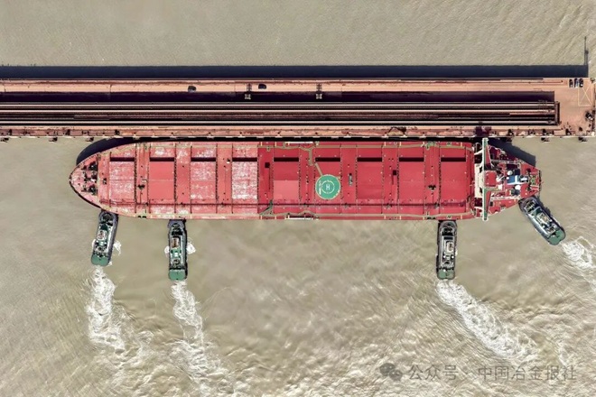圖為首艘裝載西芒杜鐵礦石船在中國寶武馬跡山港停靠。(智遠 攝)