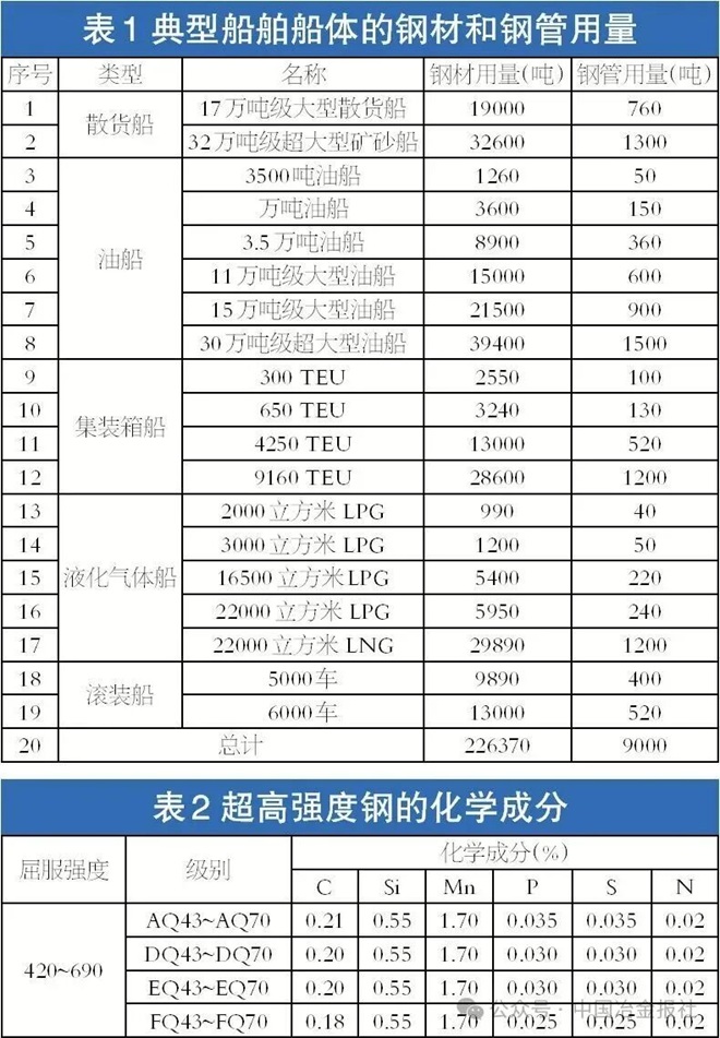 船體用鋼主要有低碳鋼、高強度鋼、超高強度鋼、特殊鋼和鑄鋼(典型船舶船體的鋼材和鋼管用量見表1)。其中,超高強度鋼通常指經過調質處理(淬火+回火)的高強度鋼,其化學成分見表2。此外,船體製造還大量應用各類特殊鋼,主要包括超低溫鋼、耐腐蝕鋼、抗層狀撕裂鋼(Z向鋼)、抗裂紋鋼和低磁鋼等。