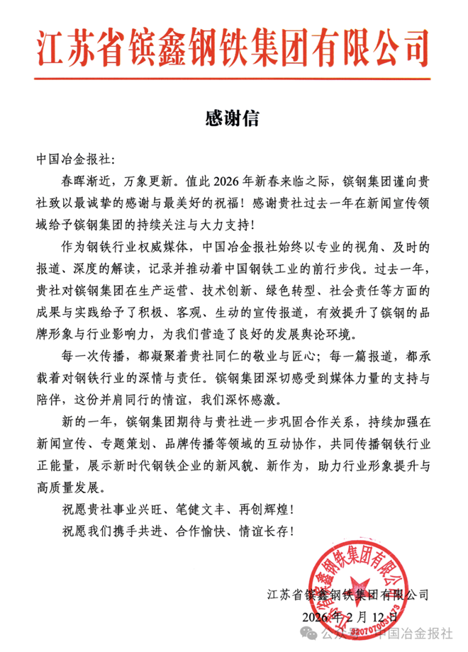 2026年2月12日,江蘇省镔鑫鋼鐵集團有限公司向中國冶金報社發來感謝信,感謝中國冶金報社作為鋼鐵行業權威媒體,始終以專業的視角、及時的報道、深shen度du的de解jie讀du,記ji錄lu並bing推tui動dong著zhe中zhong國guo鋼gang鐵tie工gong業ye的de前qian進jin步bu伐fa。感gan謝xie過guo去qu一yi年nian,中zhong國guo冶ye金jin報bao社she對dui镔bin鋼gang集ji團tuan在zai生sheng產chan運yun營ying等deng方fang麵mian的de成cheng果guo與yu實shi踐jian給gei予yu了le積ji極ji、客觀、生動的宣傳報道。