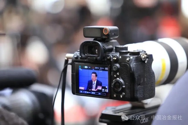 新聞發布會結束後,中國冶金報社兩會報道組記者樊三彩(右)等媒體記者們搶抓新聞,第一時間在現場拍攝小視頻報道。