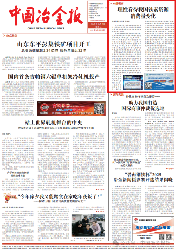 【1】 凡本網注明"來源:中國冶金報—中國鋼鐵新聞網"的所有作品,版權均屬於中國鋼鐵新聞網。媒體轉載、摘編本網所刊 作品時,需經書麵授權。轉載時需注明來源於《中國冶金報—中國鋼鐵新聞網》及作者姓名。違反上述聲明者,本網將追究其相關法律責任。
