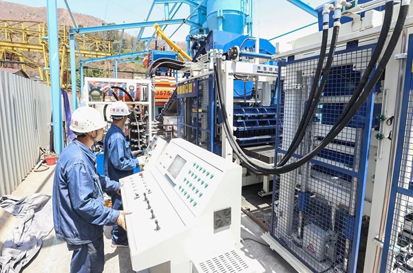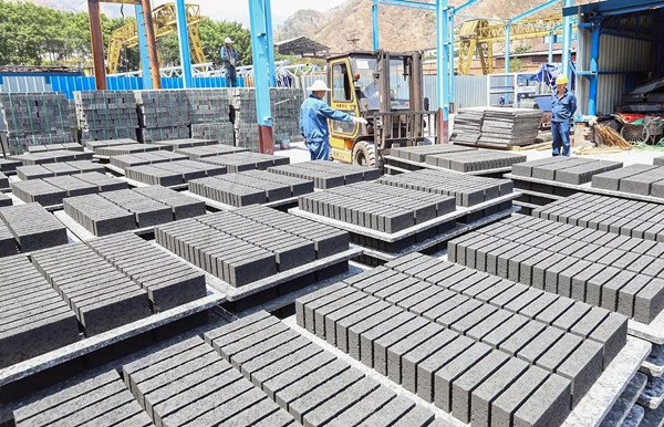 曆經艱苦努力,攀鋼建成了目前攀枝花市設備最先進、產品質量最優的免燒磚試驗線,並於今年5月10日正式運行。該試驗線具有自動化程度高、計量精度高、低能耗、低粉塵、低噪音、效率高、周期短、節能環保等優勢,通過更換模具即可生產標磚、路麵磚、植草磚、透水磚、路沿石、擋牆砌塊、空心砌塊、自保溫砌塊等不同類別、不同規格的免燒類建材製品。