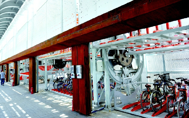 垂chui直zhi循xun環huan型xing立li體ti停ting車che庫ku是shi一yi種zhong新xin型xing的de自zi行xing車che存cun儲chu設she施shi,采cai取qu轎jiao廂xiang式shi設she計ji,將jiang自zi行xing車che進jin行xing單dan位wei化hua,更geng方fang便bian自zi行xing車che的de調tiao配pei和he安an置zhi,內nei部bu采cai用yong類lei似si摩mo天tian輪lun的de運yun作zuo模mo式shi,車che庫ku具ju有you占zhan地di麵mian積ji小xiao、利用率高、運行穩定、維護簡單、存取方便安全等特點,共提供650個停車位。為最大程度方便市民使用,操作模式采用“傻瓜式”操作,可通過二維碼實現自動存取車。同時車庫配備紅外檢測、聲控報警、遠程監控等安全係統,防止人、物在設備運行時進入工作區域。