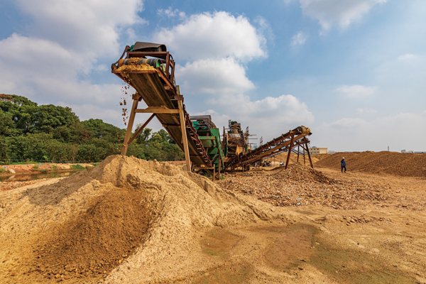 工作人員現場操作挖掘機把砂石廢棄物源源不斷投進給料機漏鬥,再由給料機均勻輸送至三級篩分機進行清洗、分(fen)離(li)。砂(sha)石(shi)中(zhong)的(de)廢(fei)棄(qi)物(wu)質(zhi)被(bei)單(dan)獨(du)剝(bo)離(li)出(chu)來(lai),經(jing)過(guo)篩(shai)分(fen)變(bian)成(cheng)粗(cu)細(xi)不(bu)等(deng)的(de)礫(li)石(shi),分(fen)別(bie)通(tong)過(guo)傳(chuan)送(song)帶(dai)傳(chuan)送(song)出(chu)來(lai)。在(zai)傳(chuan)送(song)過(guo)程(cheng)中(zhong),機(ji)械(xie)設(she)備(bei)可(ke)以(yi)清(qing)撿(jian)分(fen)離(li)出(chu)木(mu)屑(xie)、泥塊、生活垃圾等物質,砂石廢棄物資源化利用率達到90%以上。
