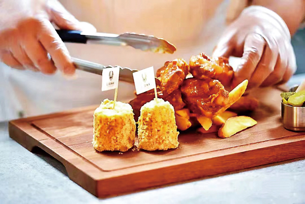 圖為LIONK獅王餐酒吧廚師正在製作美食。 (趙石岩 攝)