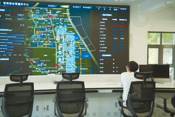 據相關人員介紹,智慧運營中心於6月底開始設計搭建,於8月25日達到投用條件。整套智慧係統共設有園區概覽、動靜交通、數字經濟、服貿會安防四大板塊。通過指揮大屏,工作人員可以足不出戶地實時監測園區內的人流量、道路交通狀況、停車場利用率等信息,並通過點擊地圖上的藍色光標調用道路監控畫麵,進而方便園區管理人員根據實際情況下達指令、做出人員調度安排,大大提高了運營效率。
