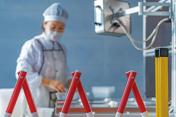 圖為該公司配餐中心職工在米飯自動裝盒機旁進行配餐。