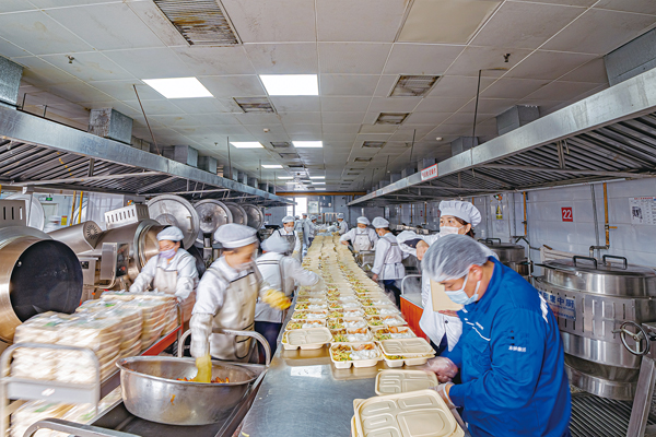 圖為該公司配餐中心忙碌的配餐車間。