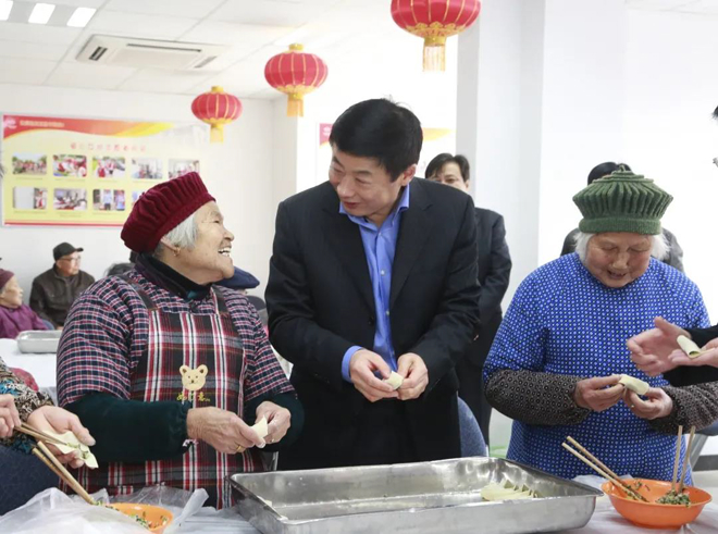 每年年初一,永聯村組織孤寡老人一起包餛飩過新年。圖為2014年1月31日,吳惠芳和老年人在永聯愛心互助街一起包餛飩