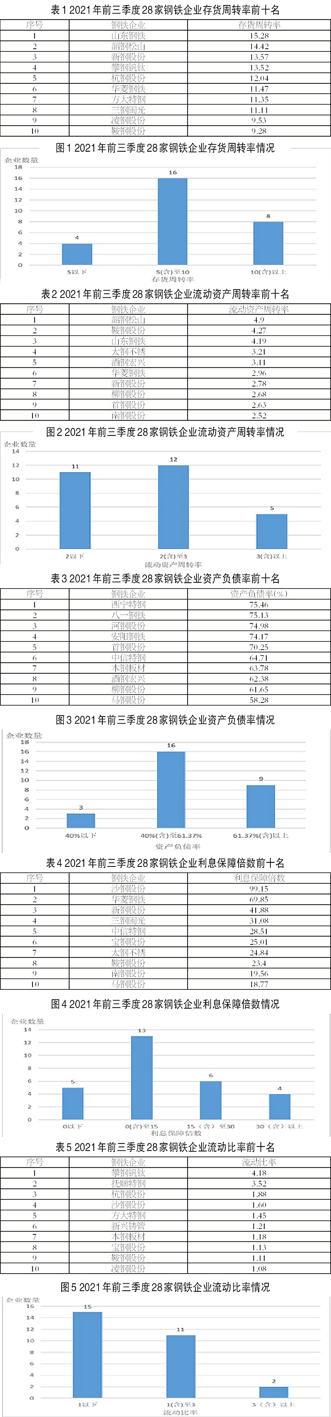 一是營運能力持續向好。從存貨周轉率看(見表1、圖1),2021年前三季度28家鋼鐵企業平均存貨周轉率為7.11次,相較2020年同期增加1.65次,相較2021年上半年增加3.04次,存貨周轉速度持續加快。主要原因:一是鋼鐵供需基本平衡,鋼鐵產量大幅下降,推升了鋼材價格,營業收入增長明顯;二是第三季度進口鐵礦石價格下降顯著,較低的鐵礦石價格壓低了鋼鐵企業存貨餘額。