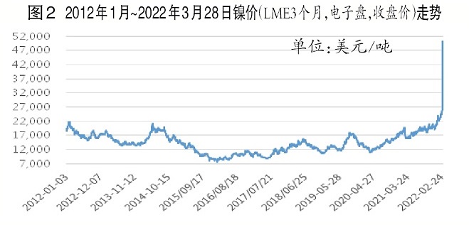 2022年以來,受新能源、局部地緣衝突等因素的刺激,鎳價不斷上攻,截至2022年3月7日,鎳價(LME3個月,電子盤,收盤價)達到50300美元/噸,創曆史新高,較2022年1月4日的21040美元/噸上漲了139%。(見圖1)