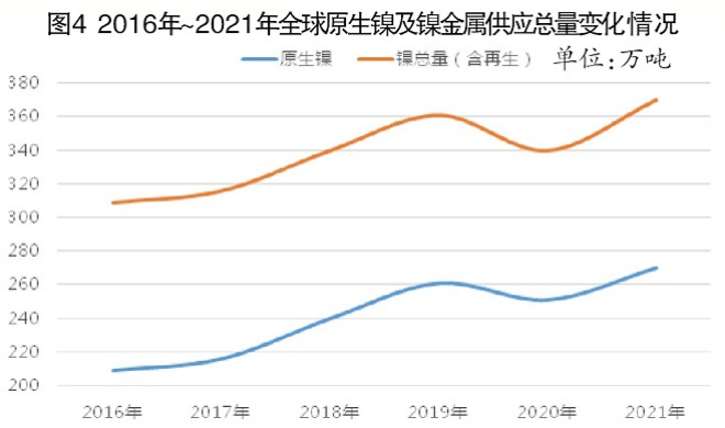 按歐盟和美國約50%的再生鎳使用量、中國20%左右的再生鎳應用比例綜合計算,全球的再生鎳利用比例在33%左右。考慮到2020年在新冠肺炎疫情影響下全球開工率較低(除中國外),折合計算的2020年全球再生鎳應用比例或在25%左右,2021年的比例也低於30%,由此折合計算的全球鎳(金屬)的供給總量從2016年的309萬噸上升至2021年的370萬噸左右,其間漲幅接近20%,年均增長率接近4%。